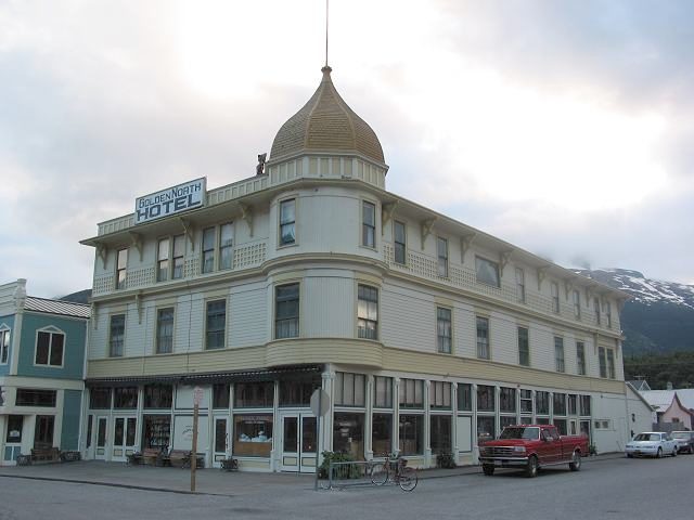 The Golden North Hotel in downtown Skagway. Outside of one of the stores on State Street were some carvings. A sunny day, flowers