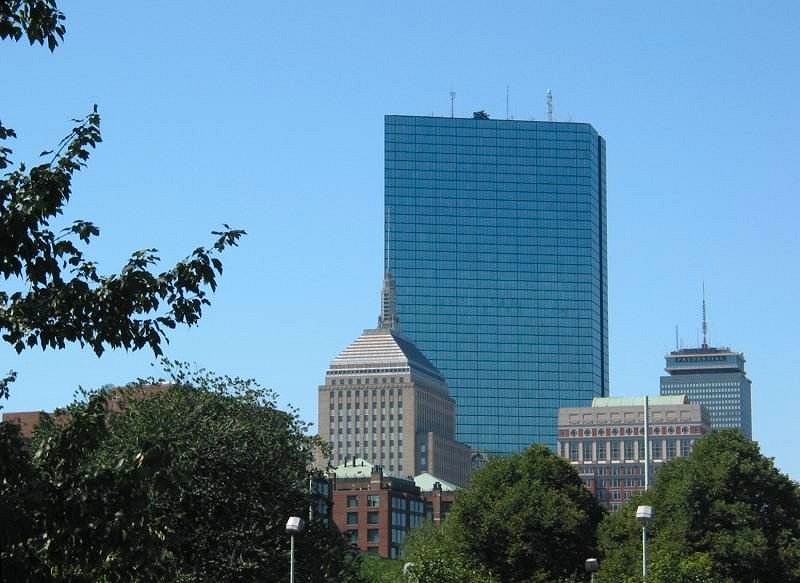 From left to right is the old Hancock building, the Hancock Tower, and the Prudential tower seen from the Boston Commons